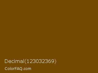 Decimal 123032369 Color is a dark orange color and the nearest color is Antique Bronze #704a07. Hex code #734903 and RGB value is rgb(115,73,3). In RGB color space, this color is composed of 45% red, 29% green, 1% blue, In CMYK color space, this color is composed of 0% cyan, 37% magenta, 97% yellow , 55% black , In HSL color space, this color has a hue angle of 38° , 95% saturation and 23% lightness.