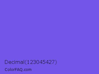 Decimal 123045427 Color is a light indigo color and the nearest color is Medium Slate Blue #7b68ee. Hex code #7355e9 and RGB value is rgb(115,85,233). In RGB color space, this color is composed of 45% red, 33% green, 91% blue, In CMYK color space, this color is composed of 51% cyan, 64% magenta, 0% yellow , 9% black , In HSL color space, this color has a hue angle of 252° , 77% saturation and 62% lightness.