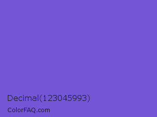 Decimal 123045993 Color is a normal indigo color and the nearest color is Slate Blue #6a5acd. Hex code #7356d5 and RGB value is rgb(115,86,213). In RGB color space, this color is composed of 45% red, 34% green, 84% blue, In CMYK color space, this color is composed of 46% cyan, 60% magenta, 0% yellow , 16% black , In HSL color space, this color has a hue angle of 254° , 60% saturation and 59% lightness.