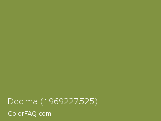 Decimal 1969227525 Color is a normal lime color and the nearest color is Sycamore #908d39. Hex code #819341 and RGB value is rgb(129,147,65). In RGB color space, this color is composed of 51% red, 58% green, 25% blue, In CMYK color space, this color is composed of 12% cyan, 0% magenta, 56% yellow , 42% black , In HSL color space, this color has a hue angle of 73° , 39% saturation and 42% lightness.
