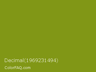 Decimal 1969231494 Color is a normal yellow color and the nearest color is Trendy Green #7c881a. Hex code #819716 and RGB value is rgb(129,151,22). In RGB color space, this color is composed of 51% red, 59% green, 9% blue, In CMYK color space, this color is composed of 15% cyan, 0% magenta, 85% yellow , 41% black , In HSL color space, this color has a hue angle of 70° , 75% saturation and 34% lightness.