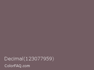 Decimal 123077959 Color is a normal rose color and the nearest color is Scorpion #695f62. Hex code #735d63 and RGB value is rgb(115,93,99). In RGB color space, this color is composed of 45% red, 36% green, 39% blue, In CMYK color space, this color is composed of 0% cyan, 19% magenta, 14% yellow , 55% black , In HSL color space, this color has a hue angle of 344° , 11% saturation and 41% lightness.