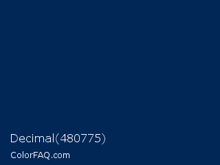 Decimal 480775 Color is a very dark blue color and the nearest color is Green Vogue #032b52. Hex code #012757 and RGB value is rgb(1,39,87). In RGB color space, this color is composed of 0% red, 15% green, 34% blue, In CMYK color space, this color is composed of 99% cyan, 55% magenta, 0% yellow , 66% black , In HSL color space, this color has a hue angle of 213° , 98% saturation and 17% lightness.
