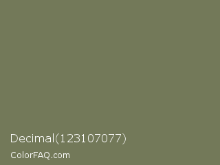 Decimal 123107077 Color is a normal lime color and the nearest color is Limed Ash #747d63. Hex code #737959 and RGB value is rgb(115,121,89). In RGB color space, this color is composed of 45% red, 47% green, 35% blue, In CMYK color space, this color is composed of 5% cyan, 0% magenta, 26% yellow , 53% black , In HSL color space, this color has a hue angle of 71° , 15% saturation and 41% lightness.