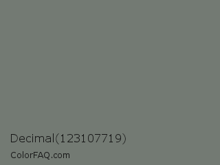Decimal 123107719 Color is a normal green color and the nearest color is Sonic Silver #757575. Hex code #737a73 and RGB value is rgb(115,122,115). In RGB color space, this color is composed of 45% red, 48% green, 45% blue, In CMYK color space, this color is composed of 6% cyan, 0% magenta, 6% yellow , 52% black , In HSL color space, this color has a hue angle of 120° , 3% saturation and 46% lightness.