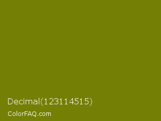 Decimal 123114515 Color is a dark yellow color and the nearest color is Olive #808000. Hex code #738005 and RGB value is rgb(115,128,5). In RGB color space, this color is composed of 45% red, 50% green, 2% blue, In CMYK color space, this color is composed of 10% cyan, 0% magenta, 96% yellow , 50% black , In HSL color space, this color has a hue angle of 66° , 92% saturation and 26% lightness.