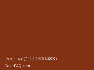 Decimal 1970300483 Color is a dark orange color and the nearest color is Kobe #882d17. Hex code #833113 and RGB value is rgb(131,49,19). In RGB color space, this color is composed of 51% red, 19% green, 7% blue, In CMYK color space, this color is composed of 0% cyan, 63% magenta, 85% yellow , 49% black , In HSL color space, this color has a hue angle of 16° , 75% saturation and 29% lightness.