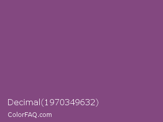 Decimal 1970349632 Color is a normal magenta color and the nearest color is Plum #8e4585. Hex code #834880 and RGB value is rgb(131,72,128). In RGB color space, this color is composed of 51% red, 28% green, 50% blue, In CMYK color space, this color is composed of 0% cyan, 45% magenta, 2% yellow , 49% black , In HSL color space, this color has a hue angle of 303° , 29% saturation and 40% lightness.