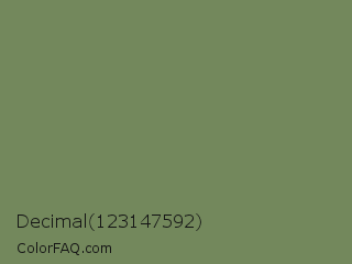 Decimal 123147592 Color is a normal green color and the nearest color is Highland #6f8e63. Hex code #73885c and RGB value is rgb(115,136,92). In RGB color space, this color is composed of 45% red, 53% green, 36% blue, In CMYK color space, this color is composed of 15% cyan, 0% magenta, 32% yellow , 47% black , In HSL color space, this color has a hue angle of 89° , 19% saturation and 45% lightness.