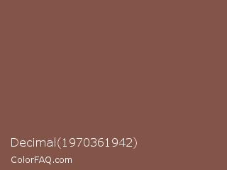 Decimal 1970361942 Color is a normal red color and the nearest color is Spicy Mix #885342. Hex code #835448 and RGB value is rgb(131,84,72). In RGB color space, this color is composed of 51% red, 33% green, 28% blue, In CMYK color space, this color is composed of 0% cyan, 36% magenta, 45% yellow , 49% black , In HSL color space, this color has a hue angle of 12° , 29% saturation and 40% lightness.