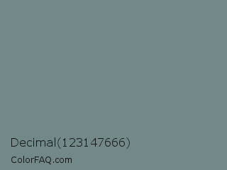 Decimal 123147666 Color is a normal cyan color and the nearest color is Blue Smoke #748881. Hex code #738888 and RGB value is rgb(115,136,136). In RGB color space, this color is composed of 45% red, 53% green, 53% blue, In CMYK color space, this color is composed of 15% cyan, 0% magenta, 0% yellow , 47% black , In HSL color space, this color has a hue angle of 180° , 8% saturation and 49% lightness.