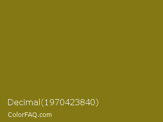 Decimal 1970423840 Color is a dark yellow color and the nearest color is Corn Harvest #8b6b0b. Hex code #837814 and RGB value is rgb(131,120,20). In RGB color space, this color is composed of 51% red, 47% green, 8% blue, In CMYK color space, this color is composed of 0% cyan, 8% magenta, 85% yellow , 49% black , In HSL color space, this color has a hue angle of 54° , 74% saturation and 30% lightness.