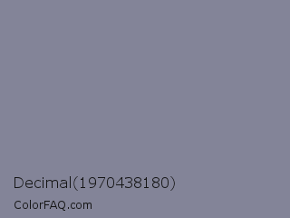 Decimal 1970438180 Color is a normal blue color and the nearest color is Roman Silver #838996. Hex code #838498 and RGB value is rgb(131,132,152). In RGB color space, this color is composed of 51% red, 52% green, 60% blue, In CMYK color space, this color is composed of 14% cyan, 13% magenta, 0% yellow , 40% black , In HSL color space, this color has a hue angle of 237° , 9% saturation and 55% lightness.