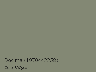 Decimal 1970442258 Color is a normal lime color and the nearest color is Bitter #868974. Hex code #838874 and RGB value is rgb(131,136,116). In RGB color space, this color is composed of 51% red, 53% green, 45% blue, In CMYK color space, this color is composed of 4% cyan, 0% magenta, 15% yellow , 47% black , In HSL color space, this color has a hue angle of 75° , 8% saturation and 49% lightness.