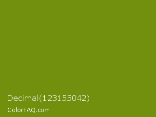 Decimal 123155042 Color is a normal lime color and the nearest color is Trendy Green #7c881a. Hex code #738f0e and RGB value is rgb(115,143,14). In RGB color space, this color is composed of 45% red, 56% green, 5% blue, In CMYK color space, this color is composed of 20% cyan, 0% magenta, 90% yellow , 44% black , In HSL color space, this color has a hue angle of 73° , 82% saturation and 31% lightness.