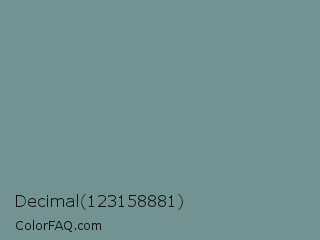 Decimal 123158881 Color is a normal cyan color and the nearest color is Juniper #6d9292. Hex code #739291 and RGB value is rgb(115,146,145). In RGB color space, this color is composed of 45% red, 57% green, 57% blue, In CMYK color space, this color is composed of 21% cyan, 0% magenta, 1% yellow , 43% black , In HSL color space, this color has a hue angle of 178° , 12% saturation and 51% lightness.