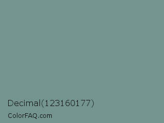 Decimal 123160177 Color is a normal cyan color and the nearest color is Juniper #6d9292. Hex code #73948f and RGB value is rgb(115,148,143). In RGB color space, this color is composed of 45% red, 58% green, 56% blue, In CMYK color space, this color is composed of 22% cyan, 0% magenta, 3% yellow , 42% black , In HSL color space, this color has a hue angle of 171° , 13% saturation and 52% lightness.