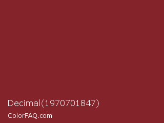 Decimal 1970701847 Color is a normal red color and the nearest color is Antique Ruby #841b2d. Hex code #842329 and RGB value is rgb(132,35,41). In RGB color space, this color is composed of 52% red, 14% green, 16% blue, In CMYK color space, this color is composed of 0% cyan, 73% magenta, 69% yellow , 48% black , In HSL color space, this color has a hue angle of 356° , 58% saturation and 33% lightness.
