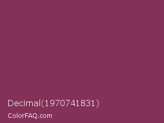Decimal 1970741831 Color is a normal rose color and the nearest color is Camelot #893456. Hex code #843157 and RGB value is rgb(132,49,87). In RGB color space, this color is composed of 52% red, 19% green, 34% blue, In CMYK color space, this color is composed of 0% cyan, 63% magenta, 34% yellow , 48% black , In HSL color space, this color has a hue angle of 333° , 46% saturation and 35% lightness.