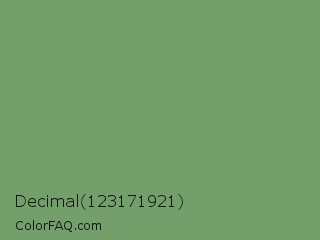 Decimal 123171921 Color is a normal green color and the nearest color is Laurel #749378. Hex code #739f6b and RGB value is rgb(115,159,107). In RGB color space, this color is composed of 45% red, 62% green, 42% blue, In CMYK color space, this color is composed of 28% cyan, 0% magenta, 33% yellow , 38% black , In HSL color space, this color has a hue angle of 111° , 21% saturation and 52% lightness.
