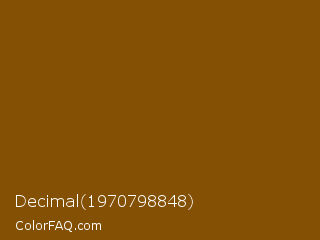 Decimal 1970798848 Color is a dark orange color and the nearest color is Rusty Nail #86560a. Hex code #845004 and RGB value is rgb(132,80,4). In RGB color space, this color is composed of 52% red, 31% green, 2% blue, In CMYK color space, this color is composed of 0% cyan, 39% magenta, 97% yellow , 48% black , In HSL color space, this color has a hue angle of 36° , 94% saturation and 27% lightness.