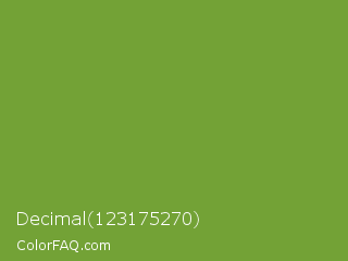 Decimal 123175270 Color is a normal green color and the nearest color is Palm Leaf #6f9940. Hex code #73a236 and RGB value is rgb(115,162,54). In RGB color space, this color is composed of 45% red, 64% green, 21% blue, In CMYK color space, this color is composed of 29% cyan, 0% magenta, 67% yellow , 36% black , In HSL color space, this color has a hue angle of 86° , 50% saturation and 42% lightness.