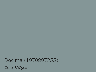 Decimal 1970897255 Color is a normal cyan color and the nearest color is Regent Gray #86949f. Hex code #849697 and RGB value is rgb(132,150,151). In RGB color space, this color is composed of 52% red, 59% green, 59% blue, In CMYK color space, this color is composed of 13% cyan, 1% magenta, 0% yellow , 41% black , In HSL color space, this color has a hue angle of 183° , 8% saturation and 55% lightness.
