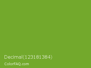 Decimal 123181384 Color is a normal green color and the nearest color is Green RYB #66b032. Hex code #73a92c and RGB value is rgb(115,169,44). In RGB color space, this color is composed of 45% red, 66% green, 17% blue, In CMYK color space, this color is composed of 32% cyan, 0% magenta, 74% yellow , 34% black , In HSL color space, this color has a hue angle of 86° , 59% saturation and 42% lightness.