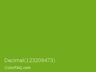 Decimal 123209473 Color is a normal green color and the nearest color is Christi #67a712. Hex code #73ac1d and RGB value is rgb(115,172,29). In RGB color space, this color is composed of 45% red, 67% green, 11% blue, In CMYK color space, this color is composed of 33% cyan, 0% magenta, 83% yellow , 33% black , In HSL color space, this color has a hue angle of 84° , 71% saturation and 39% lightness.