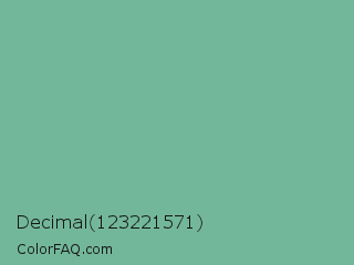 Decimal 123221571 Color is a normal green color and the nearest color is Green Sheen #6eaea1. Hex code #73b79b and RGB value is rgb(115,183,155). In RGB color space, this color is composed of 45% red, 72% green, 61% blue, In CMYK color space, this color is composed of 37% cyan, 0% magenta, 15% yellow , 28% black , In HSL color space, this color has a hue angle of 155° , 32% saturation and 58% lightness.