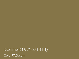 Decimal 1971671414 Color is a normal orange color and the nearest color is Gold Fusion #85754e. Hex code #857548 and RGB value is rgb(133,117,72). In RGB color space, this color is composed of 52% red, 46% green, 28% blue, In CMYK color space, this color is composed of 0% cyan, 12% magenta, 46% yellow , 48% black , In HSL color space, this color has a hue angle of 44° , 30% saturation and 40% lightness.