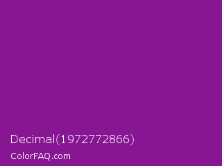 Decimal 1972772866 Color is a normal magenta color and the nearest color is Violet Eggplant #991199. Hex code #871692 and RGB value is rgb(135,22,146). In RGB color space, this color is composed of 53% red, 9% green, 57% blue, In CMYK color space, this color is composed of 8% cyan, 85% magenta, 0% yellow , 43% black , In HSL color space, this color has a hue angle of 295° , 74% saturation and 33% lightness.