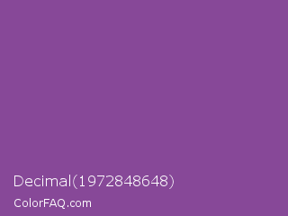 Decimal 1972848648 Color is a normal purple color and the nearest color is Vivid Violet #803790. Hex code #874898 and RGB value is rgb(135,72,152). In RGB color space, this color is composed of 53% red, 28% green, 60% blue, In CMYK color space, this color is composed of 11% cyan, 53% magenta, 0% yellow , 40% black , In HSL color space, this color has a hue angle of 287° , 36% saturation and 44% lightness.