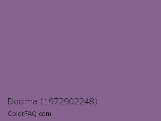 Decimal 1972902248 Color is a normal purple color and the nearest color is French Lilac #86608e. Hex code #876490 and RGB value is rgb(135,100,144). In RGB color space, this color is composed of 53% red, 39% green, 56% blue, In CMYK color space, this color is composed of 6% cyan, 31% magenta, 0% yellow , 44% black , In HSL color space, this color has a hue angle of 288° , 18% saturation and 48% lightness.