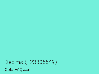 Decimal 123306649 Color is a light cyan color and the nearest color is Aquamarine #7fffd4. Hex code #73f0db and RGB value is rgb(115,240,219). In RGB color space, this color is composed of 45% red, 94% green, 86% blue, In CMYK color space, this color is composed of 52% cyan, 0% magenta, 9% yellow , 6% black , In HSL color space, this color has a hue angle of 170° , 81% saturation and 70% lightness.