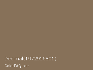 Decimal 1972916801 Color is a normal orange color and the nearest color is Shadow #8a795d. Hex code #877159 and RGB value is rgb(135,113,89). In RGB color space, this color is composed of 53% red, 44% green, 35% blue, In CMYK color space, this color is composed of 0% cyan, 16% magenta, 34% yellow , 47% black , In HSL color space, this color has a hue angle of 31° , 21% saturation and 44% lightness.