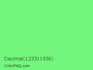 Decimal 123311936 Color is a light green color and the nearest color is Very Light Malachite Green #64e986. Hex code #73f67c and RGB value is rgb(115,246,124). In RGB color space, this color is composed of 45% red, 96% green, 49% blue, In CMYK color space, this color is composed of 53% cyan, 0% magenta, 50% yellow , 4% black , In HSL color space, this color has a hue angle of 124° , 88% saturation and 71% lightness.