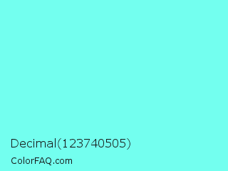 Decimal 123740505 Color is a light cyan color and the nearest color is Electric Blue #7df9ff. Hex code #73ffef and RGB value is rgb(115,255,239). In RGB color space, this color is composed of 45% red, 100% green, 94% blue, In CMYK color space, this color is composed of 55% cyan, 0% magenta, 6% yellow , 0% black , In HSL color space, this color has a hue angle of 173° , 100% saturation and 73% lightness.
