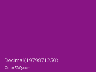 Decimal 1979871250 Color is a normal magenta color and the nearest color is Mardi Gras #880085. Hex code #881484 and RGB value is rgb(136,20,132). In RGB color space, this color is composed of 53% red, 8% green, 52% blue, In CMYK color space, this color is composed of 0% cyan, 85% magenta, 3% yellow , 47% black , In HSL color space, this color has a hue angle of 302° , 74% saturation and 31% lightness.