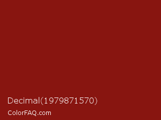 Decimal 1979871570 Color is a dark red color and the nearest color is Falu Red #801818. Hex code #881510 and RGB value is rgb(136,21,16). In RGB color space, this color is composed of 53% red, 8% green, 6% blue, In CMYK color space, this color is composed of 0% cyan, 85% magenta, 88% yellow , 47% black , In HSL color space, this color has a hue angle of 3° , 79% saturation and 30% lightness.