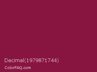 Decimal 1979871744 Color is a normal rose color and the nearest color is Rose Bud Cherry #800b47. Hex code #881540 and RGB value is rgb(136,21,64). In RGB color space, this color is composed of 53% red, 8% green, 25% blue, In CMYK color space, this color is composed of 0% cyan, 85% magenta, 53% yellow , 47% black , In HSL color space, this color has a hue angle of 338° , 73% saturation and 31% lightness.