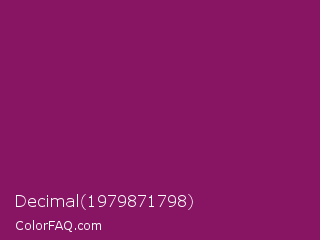 Decimal 1979871798 Color is a normal magenta color and the nearest color is Cardinal Pink #8c055e. Hex code #881564 and RGB value is rgb(136,21,100). In RGB color space, this color is composed of 53% red, 8% green, 39% blue, In CMYK color space, this color is composed of 0% cyan, 85% magenta, 26% yellow , 47% black , In HSL color space, this color has a hue angle of 319° , 73% saturation and 31% lightness.