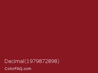 Decimal 1979872898 Color is a normal red color and the nearest color is Merlot #831923. Hex code #881722 and RGB value is rgb(136,23,34). In RGB color space, this color is composed of 53% red, 9% green, 13% blue, In CMYK color space, this color is composed of 0% cyan, 83% magenta, 75% yellow , 47% black , In HSL color space, this color has a hue angle of 354° , 71% saturation and 31% lightness.