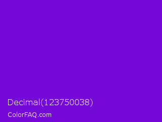 Decimal 123750038 Color is a normal purple color and the nearest color is French Violet #8806ce. Hex code #7409d8 and RGB value is rgb(116,9,216). In RGB color space, this color is composed of 45% red, 4% green, 85% blue, In CMYK color space, this color is composed of 46% cyan, 96% magenta, 0% yellow , 15% black , In HSL color space, this color has a hue angle of 271° , 92% saturation and 44% lightness.