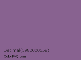 Decimal 1980000658 Color is a normal purple color and the nearest color is French Lilac #86608e. Hex code #886290 and RGB value is rgb(136,98,144). In RGB color space, this color is composed of 53% red, 38% green, 56% blue, In CMYK color space, this color is composed of 6% cyan, 32% magenta, 0% yellow , 44% black , In HSL color space, this color has a hue angle of 290° , 19% saturation and 47% lightness.