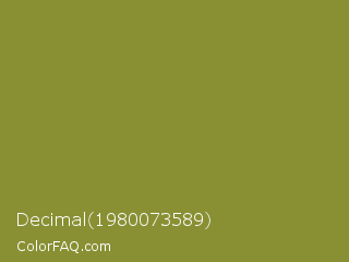 Decimal 1980073589 Color is a normal yellow color and the nearest color is Sycamore #908d39. Hex code #889033 and RGB value is rgb(136,144,51). In RGB color space, this color is composed of 53% red, 56% green, 20% blue, In CMYK color space, this color is composed of 6% cyan, 0% magenta, 65% yellow , 44% black , In HSL color space, this color has a hue angle of 65° , 48% saturation and 38% lightness.