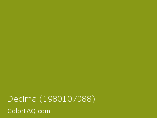 Decimal 1980107088 Color is a normal yellow color and the nearest color is Trendy Green #7c881a. Hex code #889916 and RGB value is rgb(136,153,22). In RGB color space, this color is composed of 53% red, 60% green, 9% blue, In CMYK color space, this color is composed of 11% cyan, 0% magenta, 86% yellow , 40% black , In HSL color space, this color has a hue angle of 68° , 75% saturation and 34% lightness.