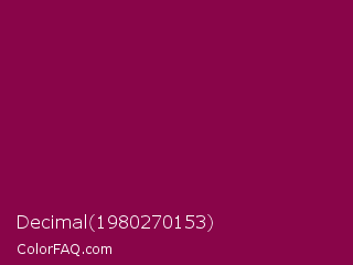 Decimal 1980270153 Color is a dark rose color and the nearest color is Rose Bud Cherry #800b47. Hex code #890549 and RGB value is rgb(137,5,73). In RGB color space, this color is composed of 54% red, 2% green, 29% blue, In CMYK color space, this color is composed of 0% cyan, 96% magenta, 47% yellow , 46% black , In HSL color space, this color has a hue angle of 329° , 93% saturation and 28% lightness.