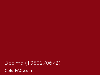 Decimal 1980270672 Color is a dark red color and the nearest color is Red Devil #860111. Hex code #890612 and RGB value is rgb(137,6,18). In RGB color space, this color is composed of 54% red, 2% green, 7% blue, In CMYK color space, this color is composed of 0% cyan, 96% magenta, 87% yellow , 46% black , In HSL color space, this color has a hue angle of 355° , 92% saturation and 28% lightness.
