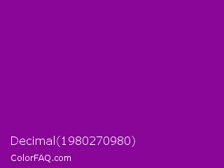 Decimal 1980270980 Color is a normal magenta color and the nearest color is Dark Magenta #8b008b. Hex code #890698 and RGB value is rgb(137,6,152). In RGB color space, this color is composed of 54% red, 2% green, 60% blue, In CMYK color space, this color is composed of 10% cyan, 96% magenta, 0% yellow , 40% black , In HSL color space, this color has a hue angle of 294° , 92% saturation and 31% lightness.